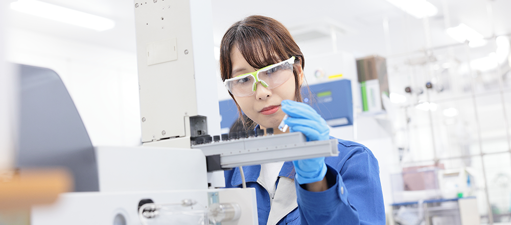 製造部署からの依頼を受け、工程管理や出荷製品の成分測定等の業務に携わります。その他分析機器や試薬の管理を通して分析精度の維持・向上を目指すなど、当社製品の品質保証の役割を担います。さらに開発センターでは、機能化学品等の研究が進められており、それらの分析業務や開発業務に携わることもあります。
