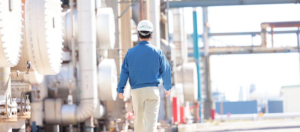 千葉工場は北地区、南地区、タンクヤード、甲子地区と分かれており、敷地の総面積が731,020㎡とスケールがとても大きく、エチレンプラントを2基保有しています。間接部門と製造部署があり、約700名の社員が千葉工場・事務所で働いています。