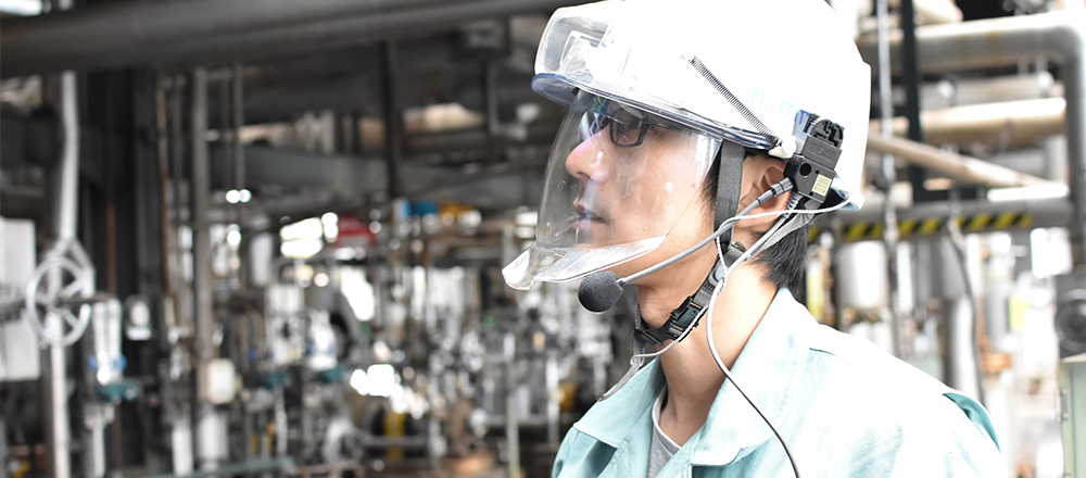 千葉工場は北地区、南地区、タンクヤード、甲子地区と分かれており、敷地の総面積が731,020㎡とスケールがとても大きく、エチレンプラントを2基保有しています。間接部門と製造部署があり、約700名の社員が千葉工場・事務所で働いています。